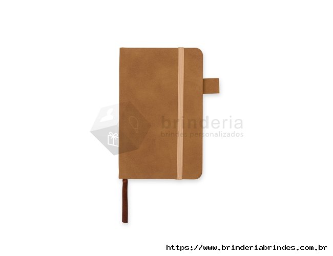 Caderneta em PU com marcador de página em cetim e fita elástica para fechar. Contém aproximadamente 80 folhas amareladas sem pauta.