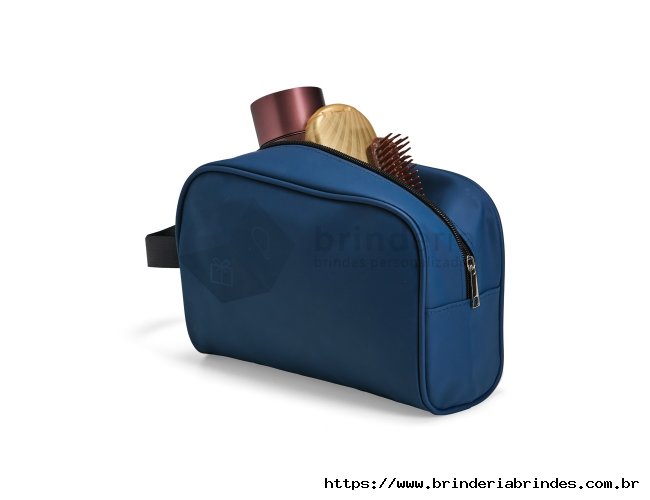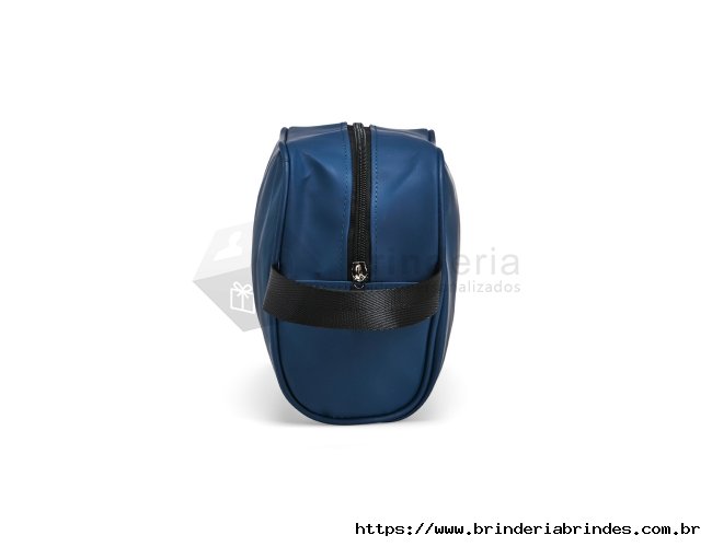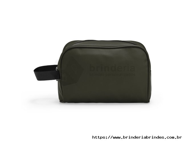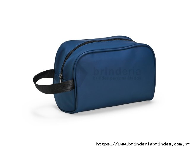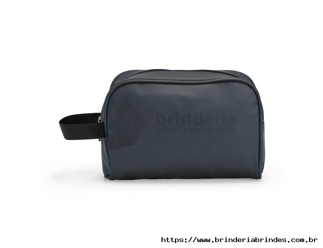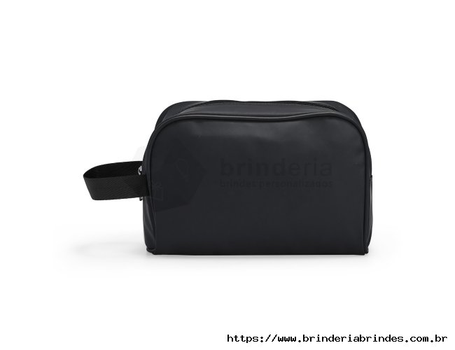 Nécessaire em couro sintético impermeável com fechamento em zíper e alça lateral confeccionada em nylon.