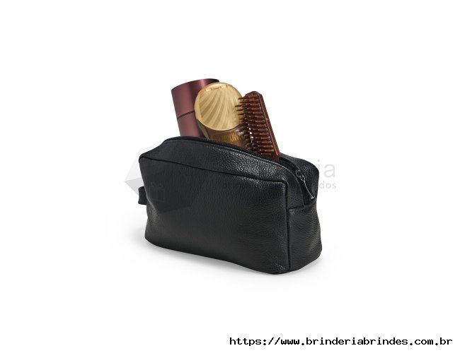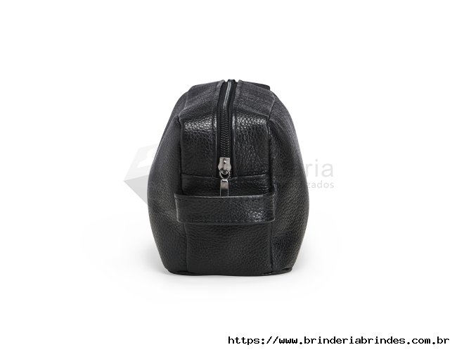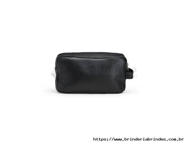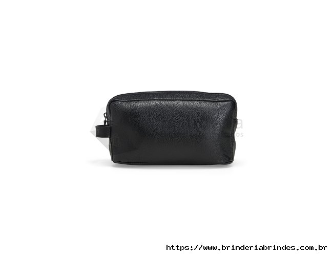 Nécessaire em couro, com fechamento em zíper, alça lateral de mão e plaquinha presa a cordão de nylon.