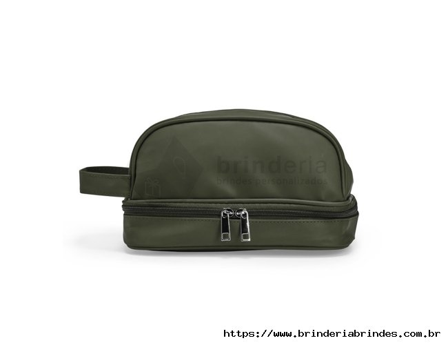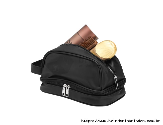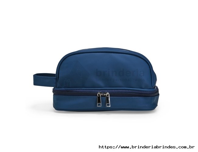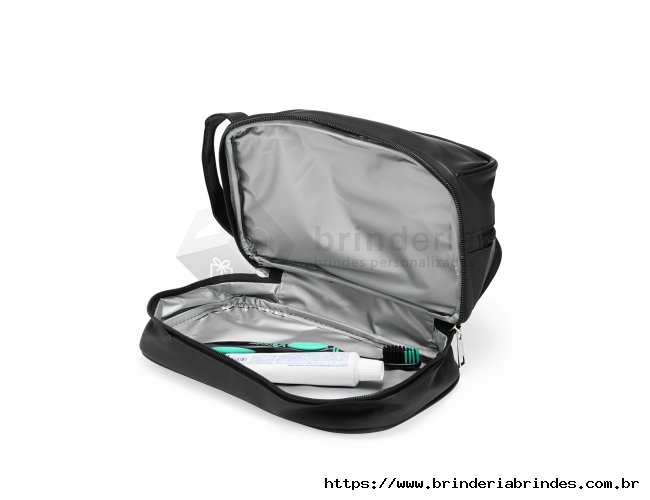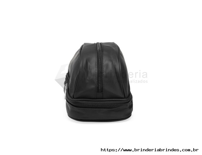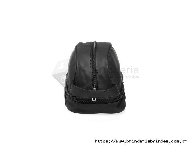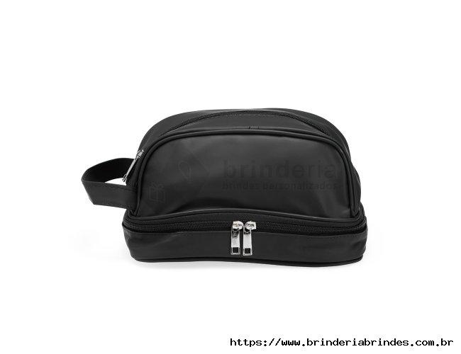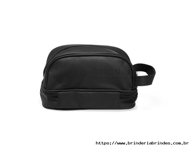 Nécessaire confeccionada em couro sintético impermeável. Possui alça lateral de mão e dois compartimentos com fechamento em zíper: o principal, na parte superior, e outro na parte inferior, ideal para guardar itens úmidos.
