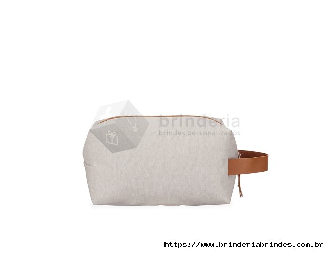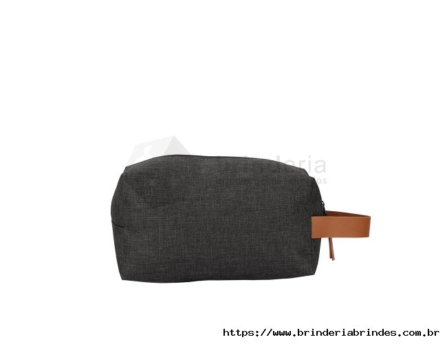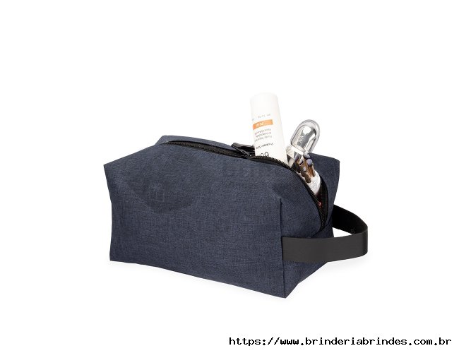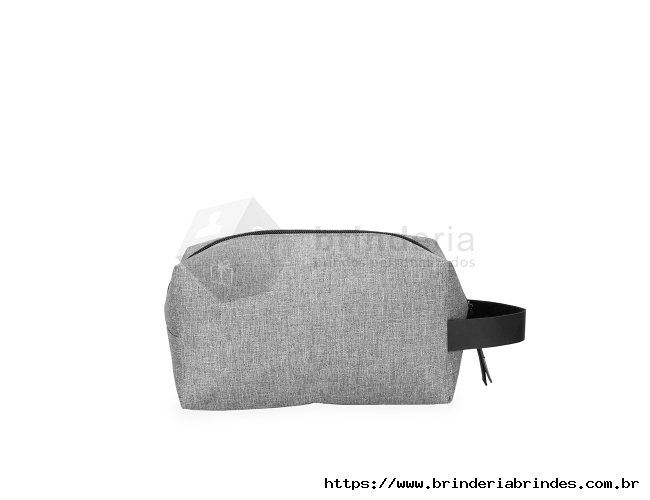 Nécessaire confeccionada em nylon resistente à água, fechamento em zíper, puxador e alça lateral para transporte em couro sintético.