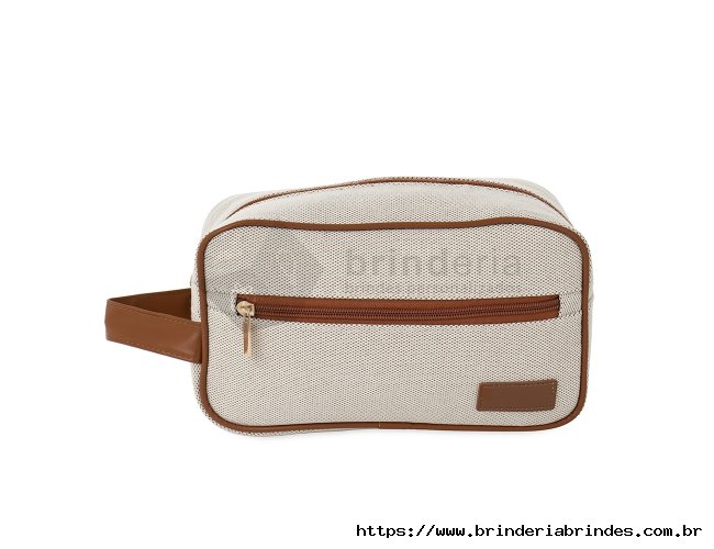 Nécessaire confeccionada em lona e fechamento em zíper. Possui bolso frontal e compartimento principal com três bolsos internos, além de alça lateral e plaquinha costurada em couro sintético.