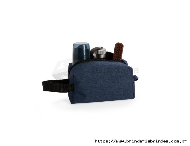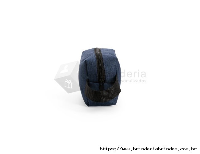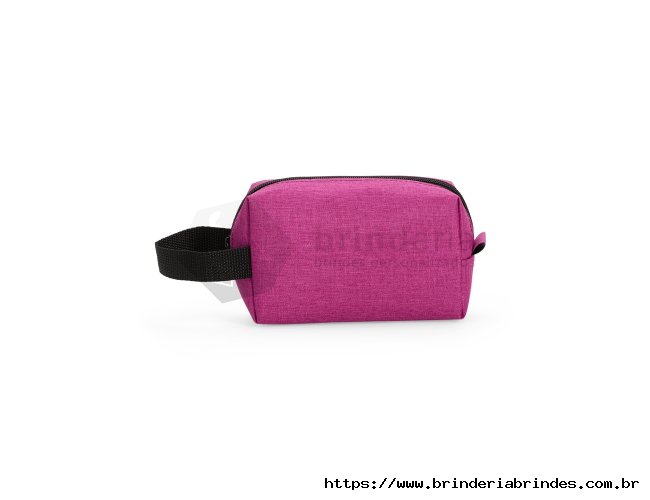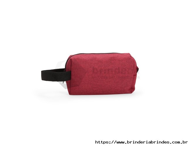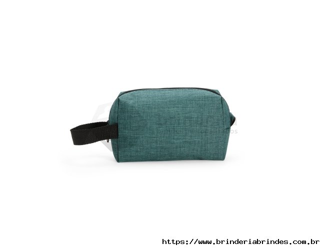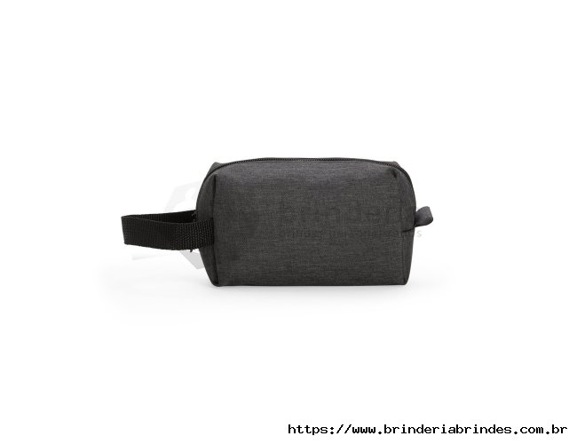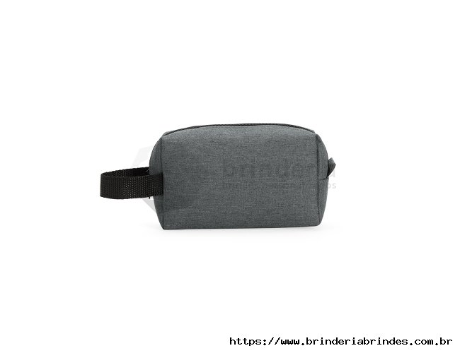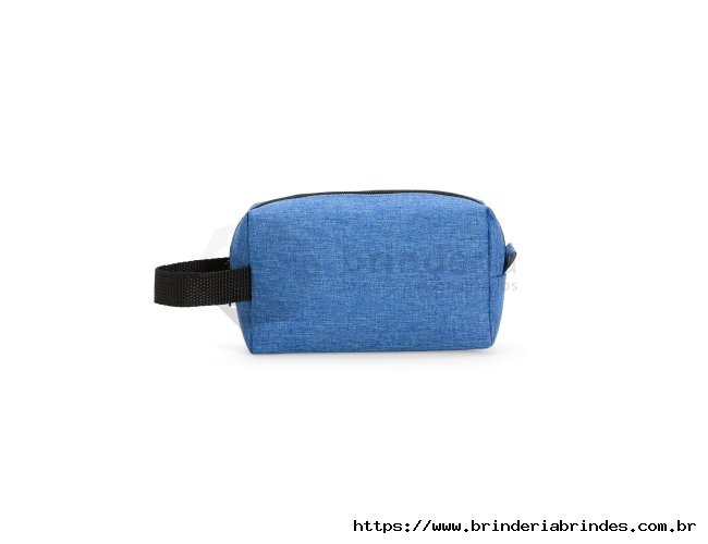 Nécessaire em Poliéster mesclado com PVC resistente à água e fechamento em zíper. Possui alça lateral em nylon para transporte e uma pequena alça para acesso de chaveiro ou gancho.