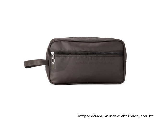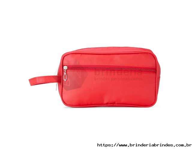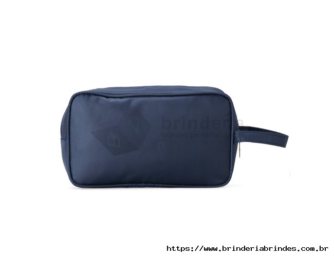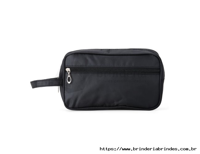 Nécessaire confeccionado em poliéster resistente à água e fechamento em zíper. Possui bolso frontal e uma alça de mão costurada na lateral.