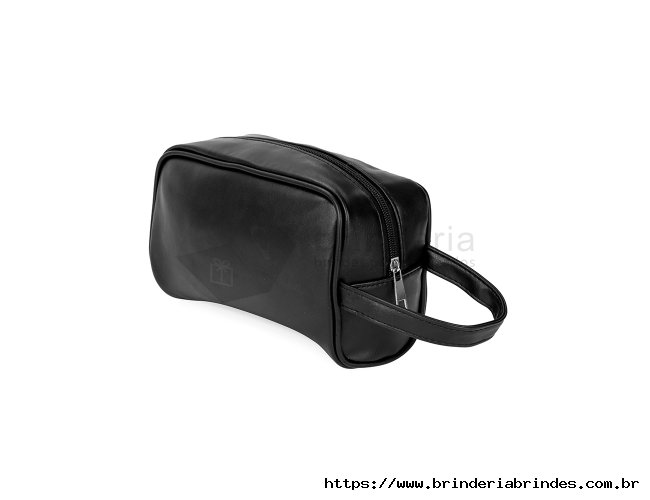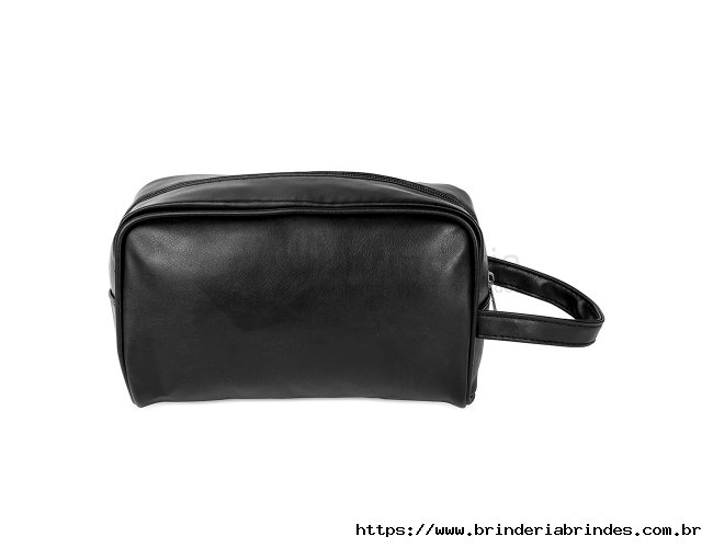 Nécessaire confeccionada em poliuretano (PU) liso impermeável com fechamento em zíper e alça lateral para transporte.