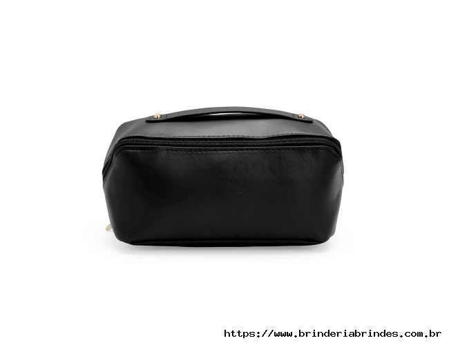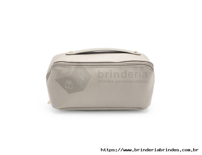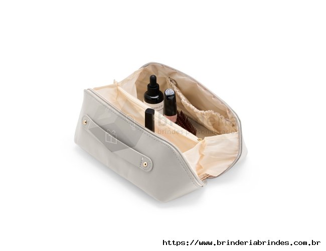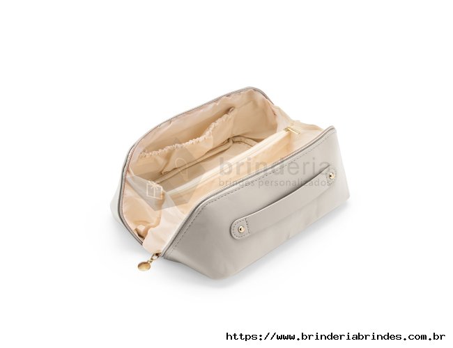 Nécessaire em poliuretano (PU) impermeável com abertura em 180 graus inspirada no formato de concha. O compartimento interno conta com dois bolsos laterais abertos e um, localizado na parte central, com fechamento em zíper. Possui alça para transporte.