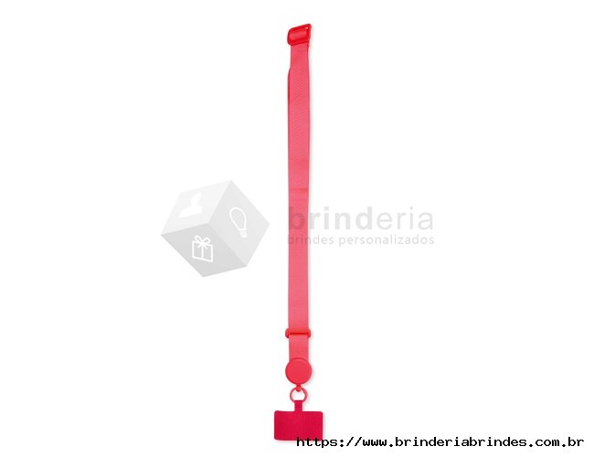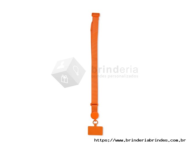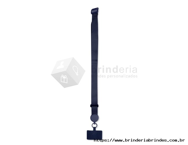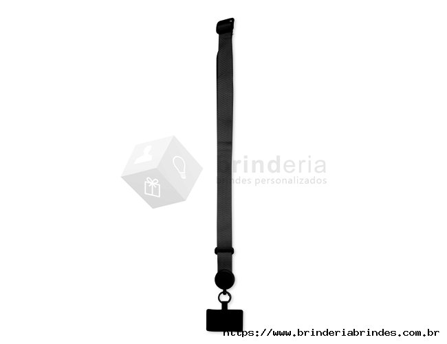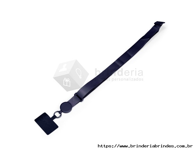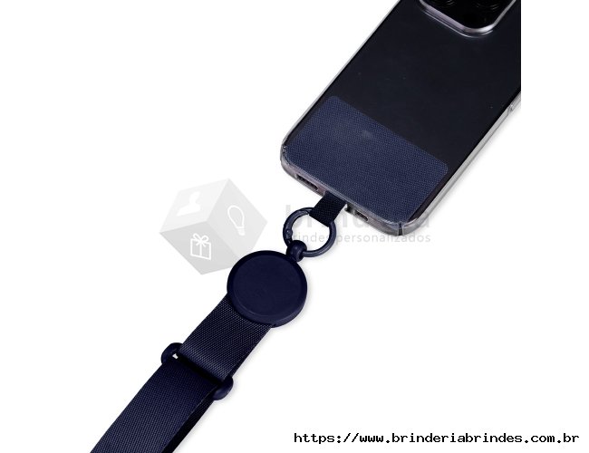 Cordão com alça ajustável para celular feito em poliéster. O acessório é fixado a um cartão retangular que se encaixa na parte interna da capa do celular, próximo à entrada de carregamento USB.