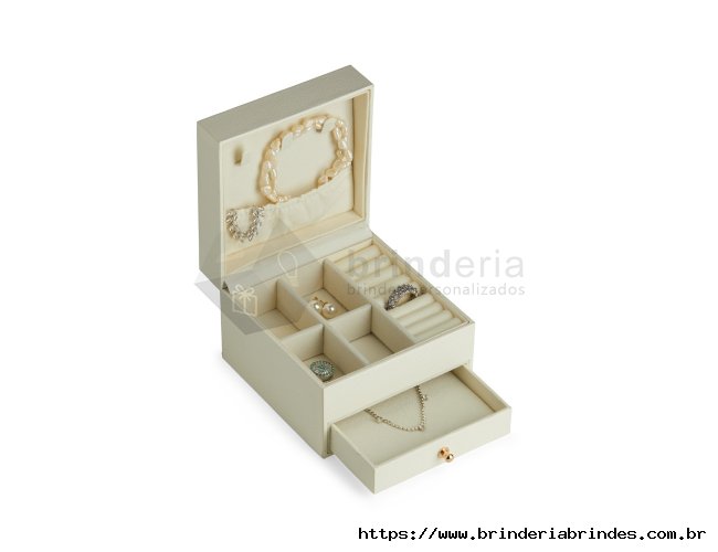 Porta joias de couro sintético com revestimento aveludado. Possui gaveta e compartimentos internos para anéis, brincos, pulseiras e colares.