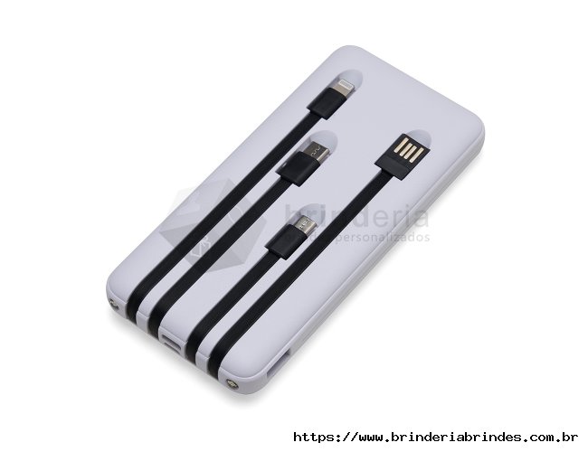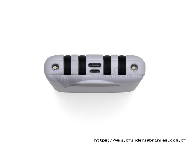 Carregador portátil de 10.000mAh com display digital indicador de bateria, contém duas lanternas de led e quatro cabos de saída acoplados, sendo: saída Lightning, saída Tipo-C, saída V8 e saída USB. O carregador possui uma porta USB dupla (entrada e saída) com carga rápida e outras duas portas de entrada: V8 e Tipo-C. Acompanha cabo USB.