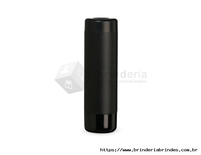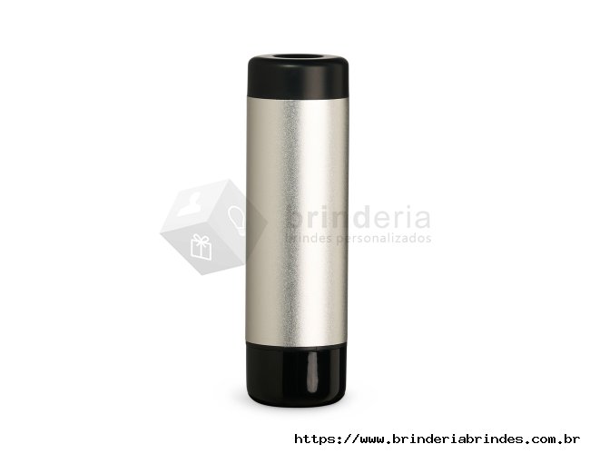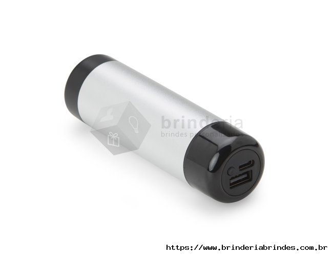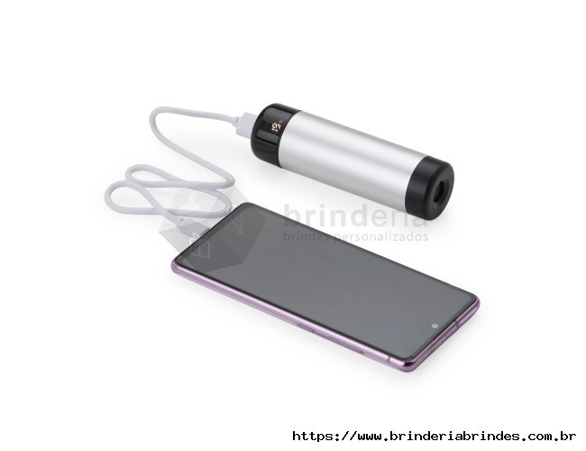 Power Bank com estrutura em metal e detalhes em plástico. Possui capacidade de 4.000 mAh, entradas USB e USB-C, além de lanterna LED integrada. Acompanha cabo USB-C.