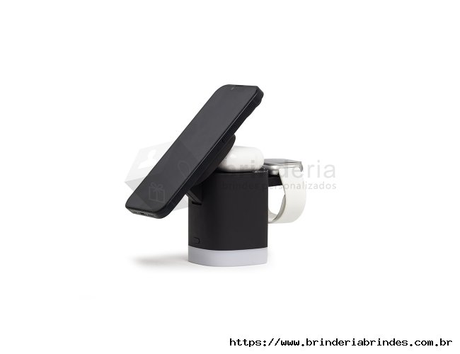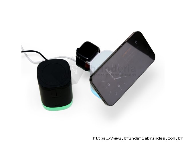 Carregador 3 em 1? A nossa base de carregamento é diferenciada, já que possui indução para relógio, fones e celular, e você pode usá-los todos ao mesmo tempo, basta que o celular e demais dispositivos tenham a tecnologia QI. O LED RGB possui 2 modos, luz branca e vermelho, verde e azul se alternando. A base não armazena energia, portanto, precisa estar conectada ao cabo tipo-C que a acompanha.