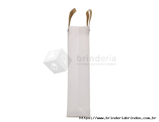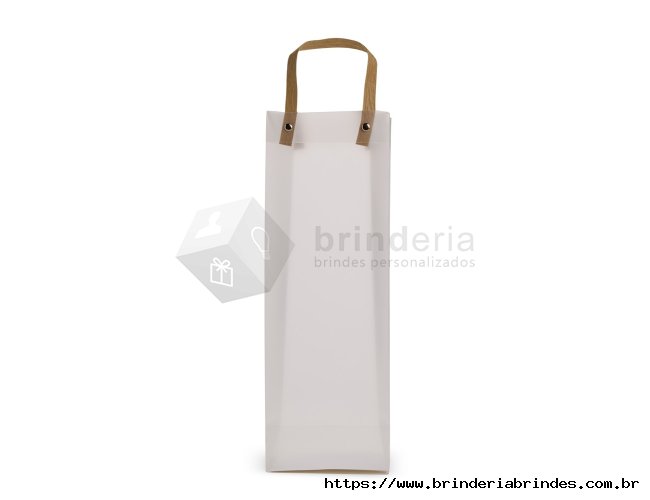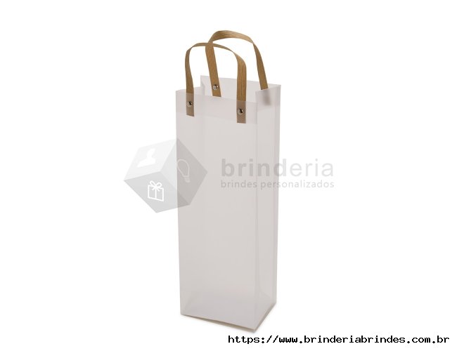 Sacola plástica com formato retangular, acabamento fosco e alças em papelão fixadas por botões metálicos.