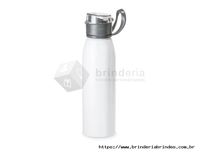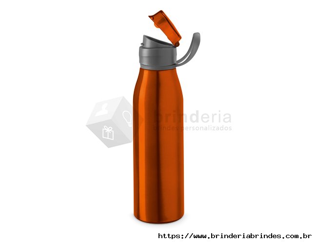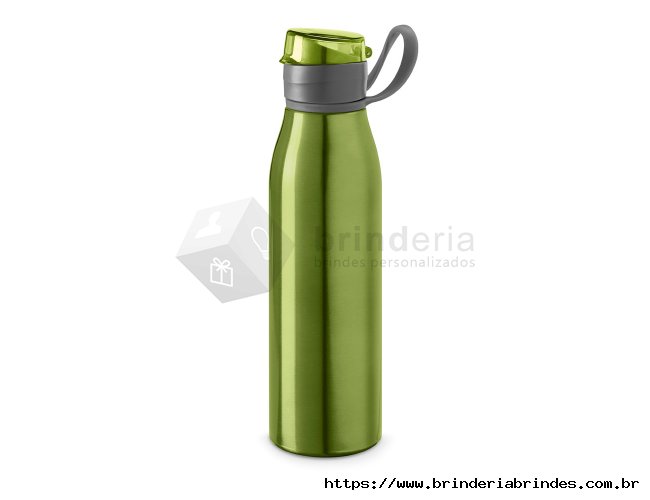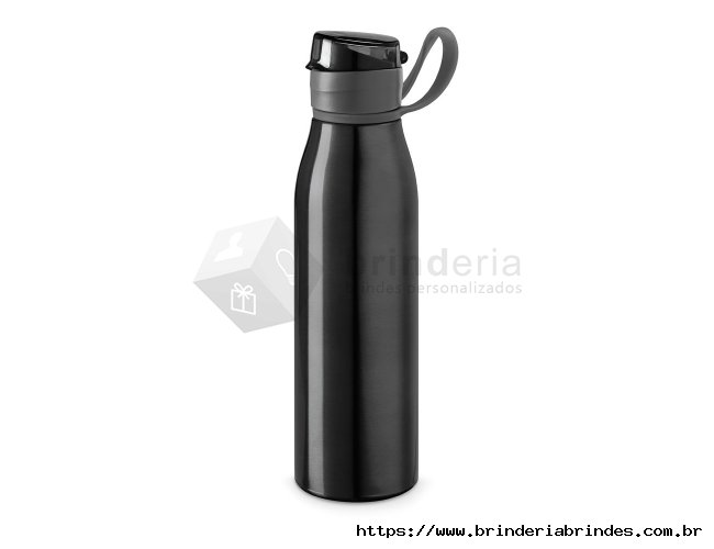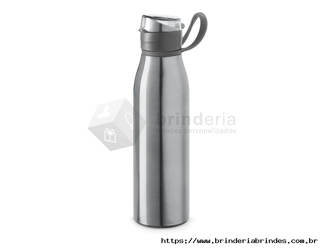 Garrafa 650ml em inox. Tampa plástica rosqueável com proteção para o bocal e alça emborrachada para transporte