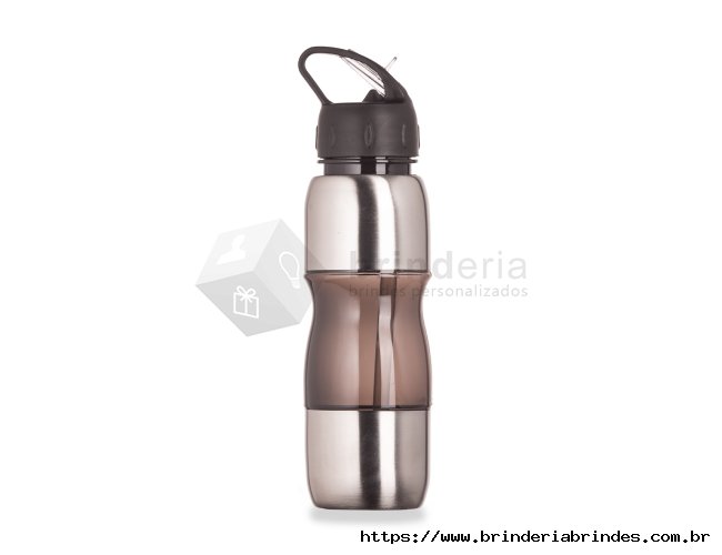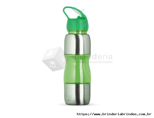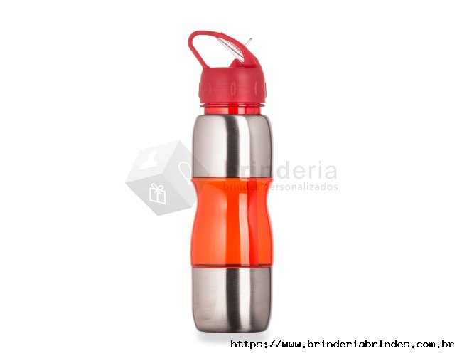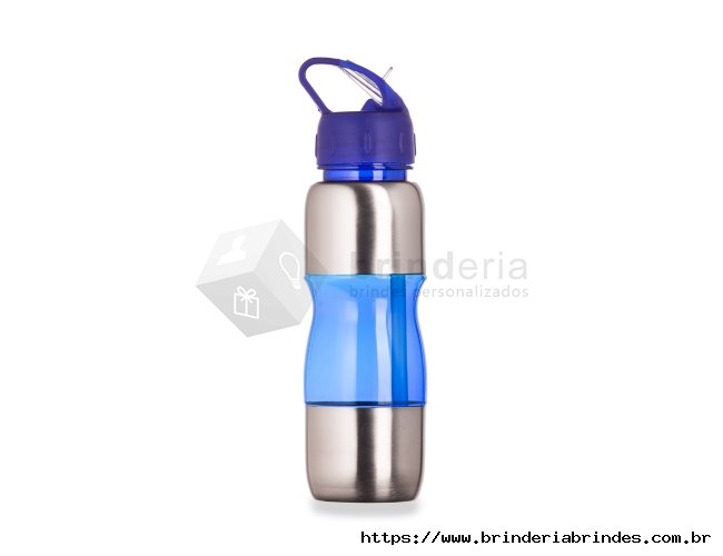 Squeeze de alumínio 600ml com alça plástica e bico de canudo. Possui detalhes plástico coloridos, tampa rosqueável com bico e canudo interno.