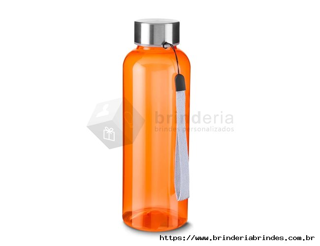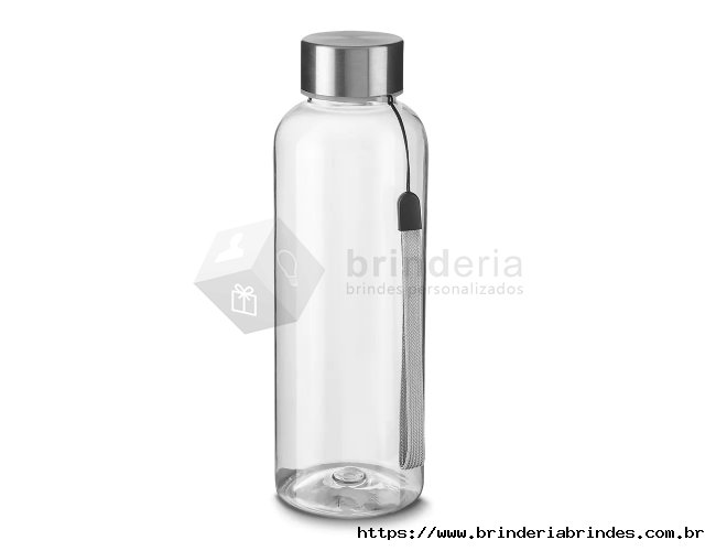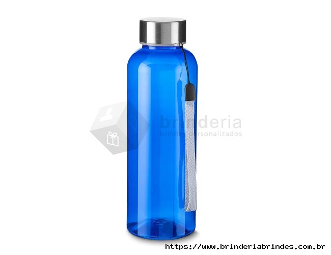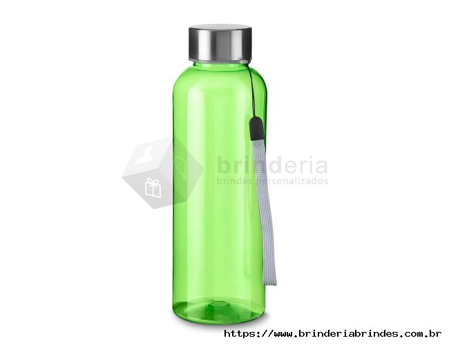 Garrafa plástica 500 ml feita em material PET reciclado. Tampa de metal rosqueável com cordão.