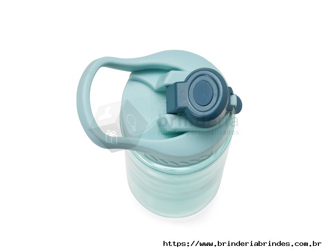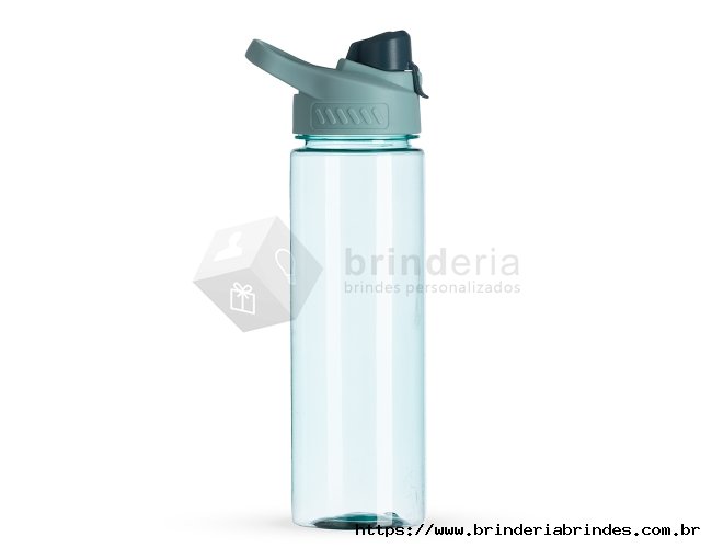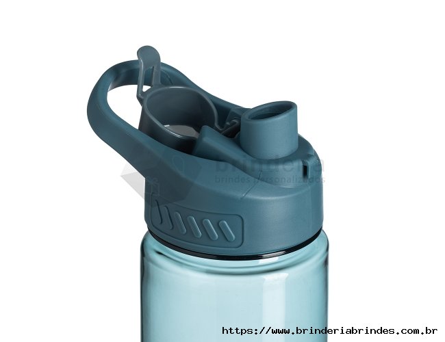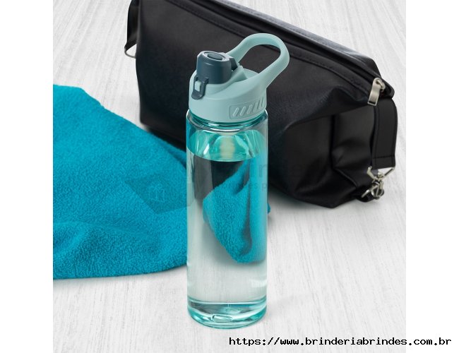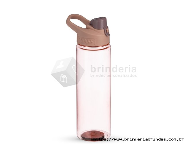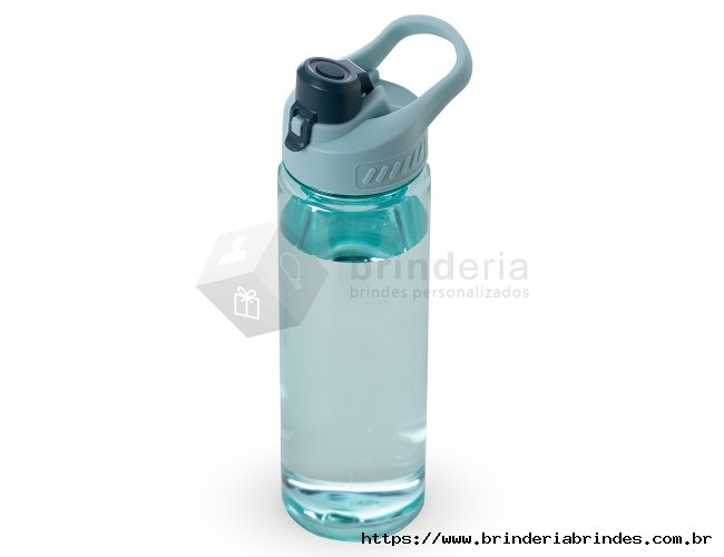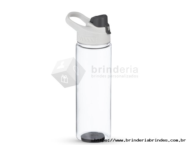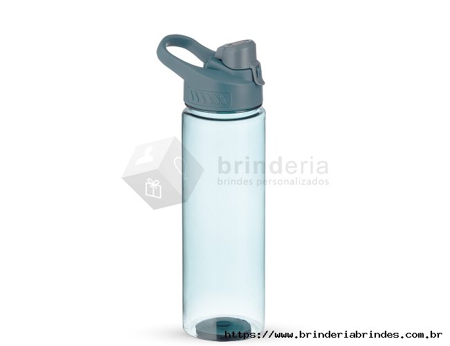 Squeeze plástico 700ml com alça para transporte, possui tampa principal rosqueável e tampa de proteção plástica com trava para o bocal.