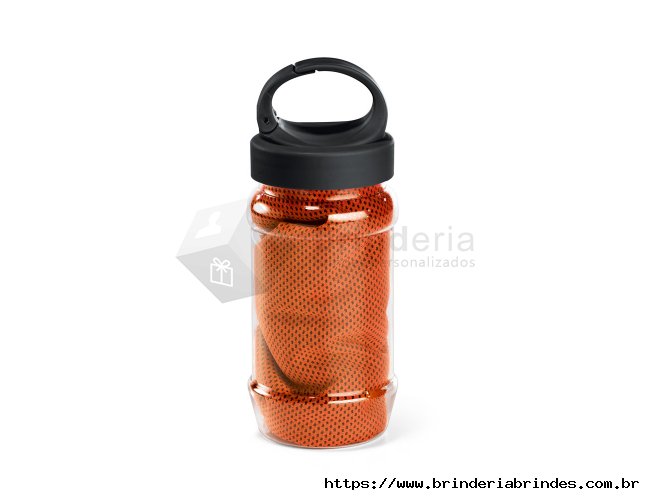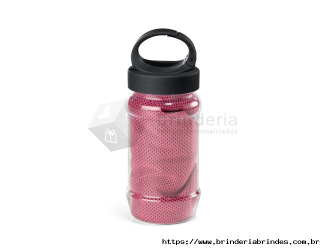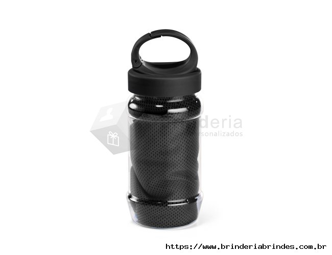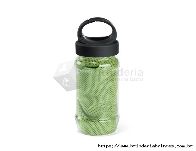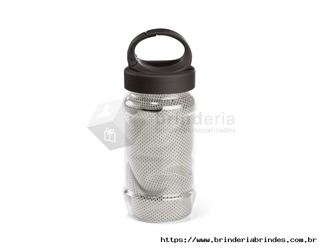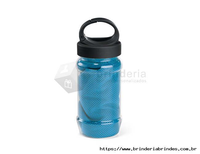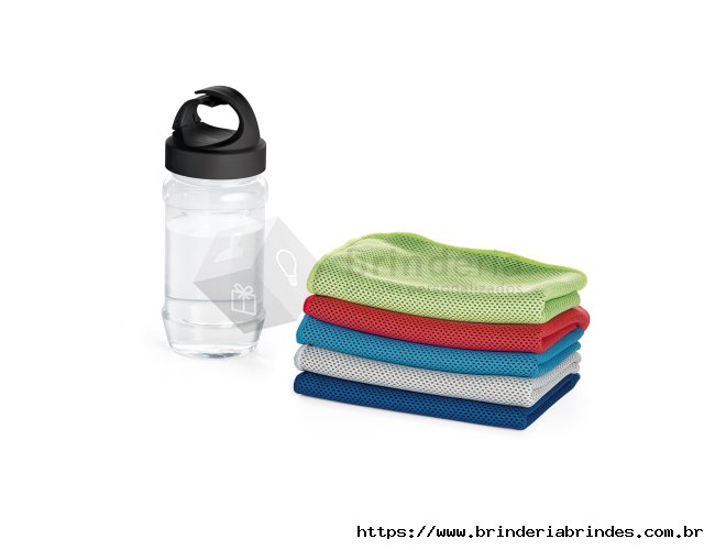 Toalha para esporte. Toalha: poliamida e poliéster. Garrafa: PP e PET. Toalha refrescante, quando molhada permanece fria durante horas. Se aquecer, basta balançar reativando sua frescura. Reutilizável e lavável à máquina. Garrafa com mosquetão inclusa (food grade). Toalha: 300 x 800 mm | Garrafa: 65 x 125 mm com capacidade de 440ml