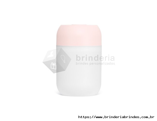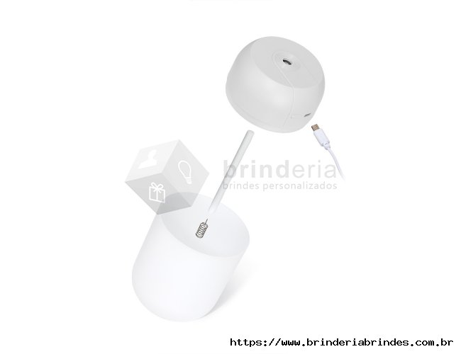 Umidificador de ar feito em plástico com reservatório de água com capacidade para até 300ml e iluminação em LED. Possui dois modos de névoa: contínuo e intermitente. Acompanha cabo Micro USB e filtro de algodão.